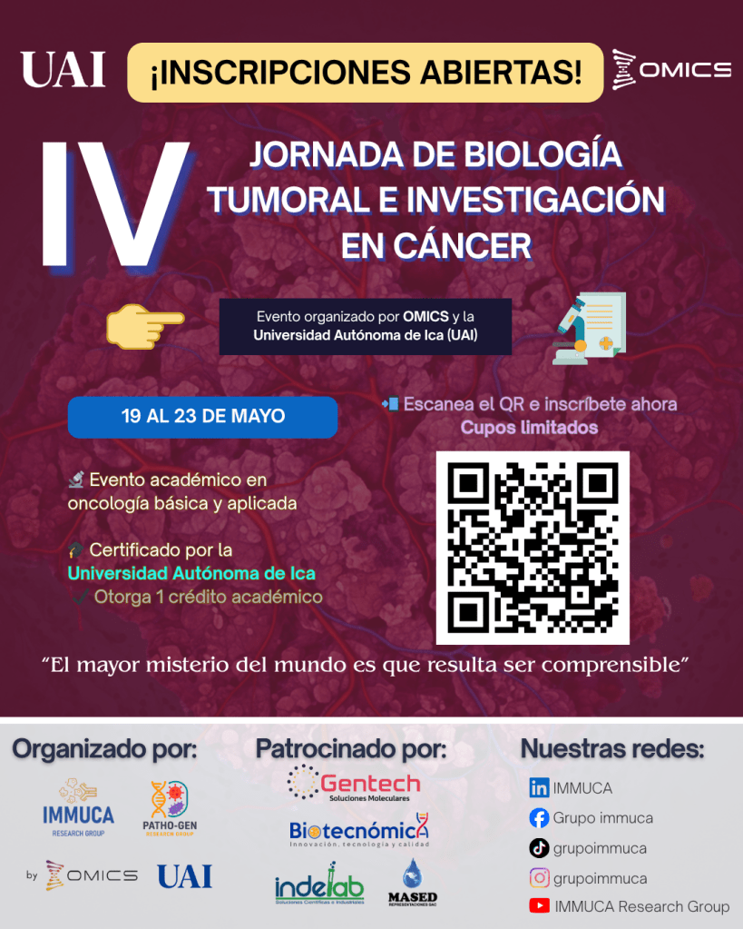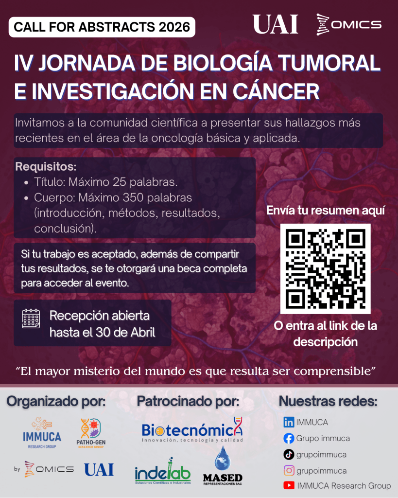 IV Jornada en Biología Tumoral e Investigación en Cáncer, que será realizada de forma virtual este 19, 20, 21 y 23 de mayo de 2026.